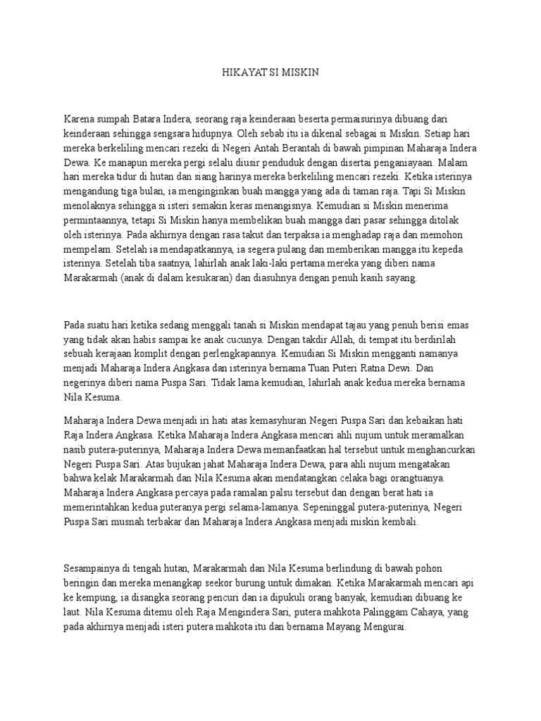 Baginda berkata akan kau gunakan apa daun mangga itu?. Ke manapun mereka pergi selalu diusir penduduk. Akan tetapi, karena mendapat kutukan dari dewa maka mereka mengalami nasib menjadi si miskin. Memang hikayat bukan merupakan bentuk dari karya sastra lama yang umumnya banyak peminatnya. Contohnya adalah hikayat jaya lengkara, hikayat si miskin, dan hikayat inderaputera.